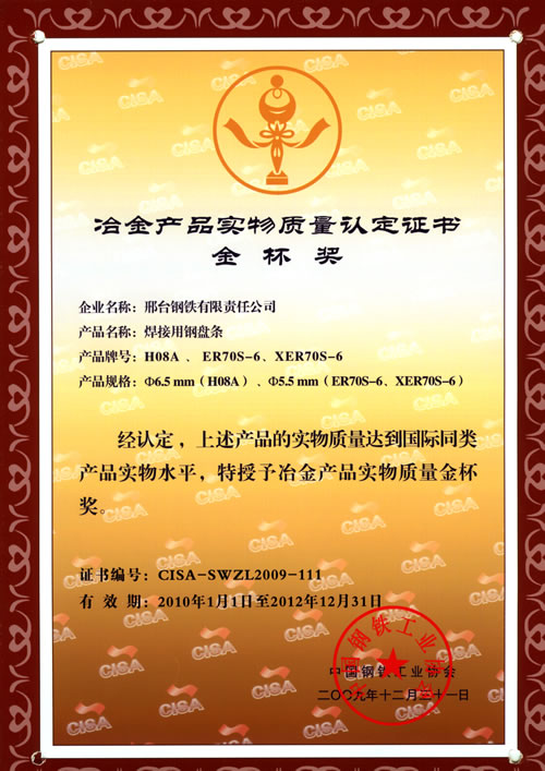 Wire H08A, ER70S-6 and XER40S-6 for welding awarded the Gold Cup Prize of Metallurgy products.