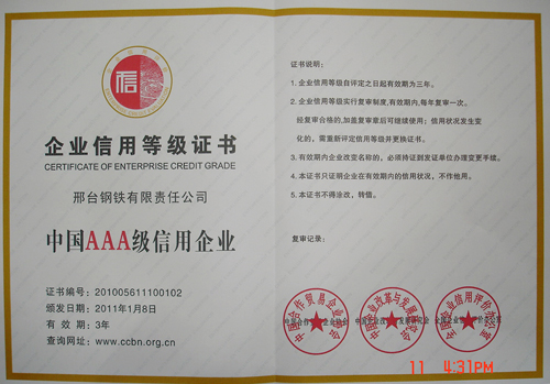 2010年11月,中國(guó)出入境檢驗(yàn)檢疫協(xié)會(huì)授予邢鋼“中國(guó)質(zhì)量誠(chéng)信企業(yè)”。