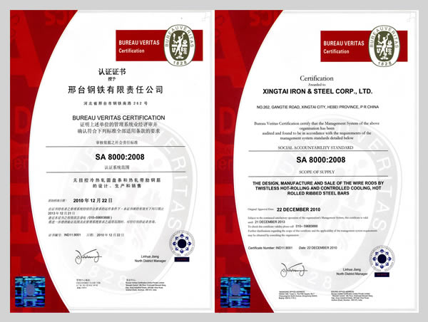 2010年12月22日,邢鋼在全國(guó)鋼鐵行業(yè)中首家通過SA8000社會(huì)責(zé)任體系認(rèn)證。