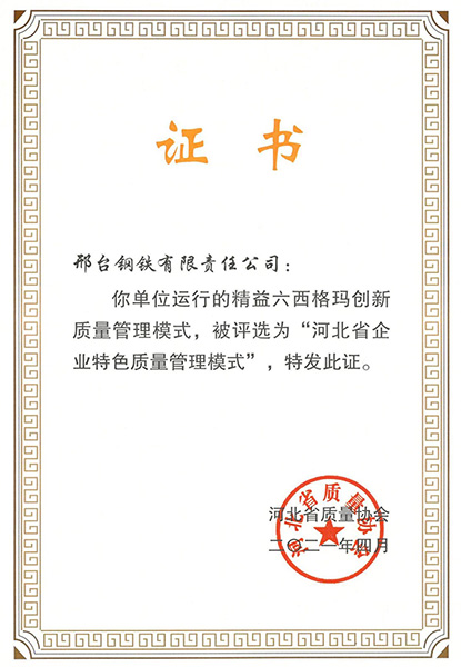 2021年4月,由河北省質(zhì)量協(xié)會評選的首批“河北省企業(yè)特色質(zhì)量管理模式”名單揭曉。邢鋼申報的“精益六西格瑪創(chuàng)新管理模式”,憑借理念先進(jìn)、方法科學(xué)、措施易行、效果明顯等優(yōu)勢上榜首批名單。