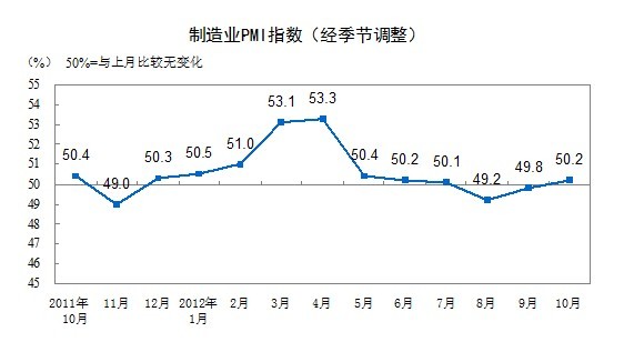 2012年10月,中國制造業(yè)采購經(jīng)理指數(shù)(PMI)為50.2%,比上月上升0.4個百分點(diǎn),重新回到臨界點(diǎn)之上。