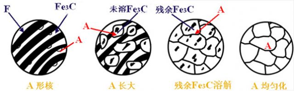 共析鋼奧氏體化:熱處理加熱至Ac1以上時(shí),將全部奧氏體化,過程如下圖。