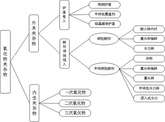 而外來夾雜主要是在鋼的熔煉、出鋼和澆鑄過程中,鋼液同耐火材料和爐渣相接觸,爐渣被卷入鋼液中(特別是出鋼的時候),耐火材料在高溫收到?jīng)_蝕,它的顆?;烊脘撘褐校@些情況都難以避免?;烊脘撘褐械哪突鸩牧虾蜖t渣顆粒通過與鋼液起化學(xué)反應(yīng)不斷在成分和結(jié)構(gòu)上發(fā)生變化。這些顆粒,不論是剛剛被機(jī)械地帶入鋼液中的,還是經(jīng)歷了相當(dāng)變化的,一旦被滯留到鑄件中,就變成了鋼中的夾雜物,這些就叫外來夾雜物。外來一般來說尺寸較大,外形不規(guī)則,結(jié)構(gòu)復(fù)雜,只是偶然在這里或者那里出現(xiàn)。夾雜物的來源和分類下圖。