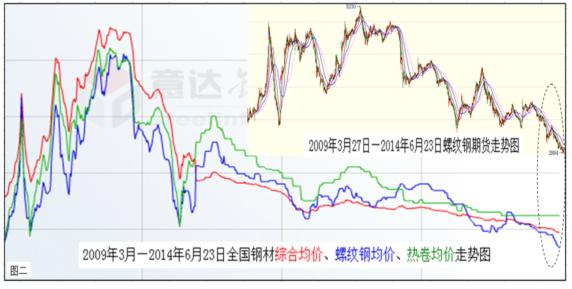 底線的提高,勢必助推中國經(jīng)濟(jì)大勢呈現(xiàn)前低后高的走勢。而經(jīng)過長期低迷的中國鋼材市場,也已經(jīng)具備逐漸走強(qiáng)的兩大要素:一是鋼市走強(qiáng)的外在環(huán)境趨好(見上圖一)。包括上半年推出一系列微刺激效應(yīng)逐漸顯現(xiàn),下半年由于經(jīng)濟(jì)增長底線提高,以及持續(xù)加推的動力措施等合成發(fā)酵,定會形成遠(yuǎn)比上半年良好的鋼市發(fā)展環(huán)境;二是鋼市走強(qiáng)的內(nèi)在動能充沛(下圖二)。鋼材價格經(jīng)過長期下跌后,已經(jīng)下穿了所有的技術(shù)阻力位,使業(yè)內(nèi)根本無法從技術(shù)面進(jìn)行詮釋。但從價值規(guī)律、市場規(guī)律以及基本面情況看,目前鋼材價格的底部特征已經(jīng)十分明顯,空方量能也已近衰竭。因此,經(jīng)過短時間的整固蓄勢后,震蕩上揚(yáng)應(yīng)該是后期運(yùn)行的主基調(diào)。如果再結(jié)合宏觀上經(jīng)濟(jì)增長底線的提高,下半年鋼材價格恢復(fù)性上揚(yáng)既在情理之中,也是勢所必然。所以,基于經(jīng)濟(jì)和鋼市大勢筆者作出,下半年全國鋼材價格勢必高于上半年的預(yù)測。