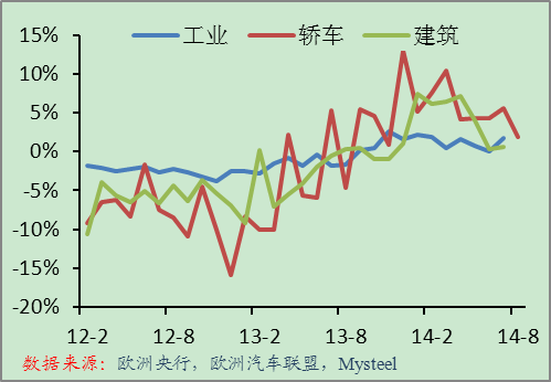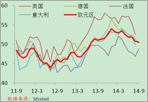 歐元區(qū)9月制造業(yè)PMI初值為50.5%,連續(xù)5個月環(huán)比下降,表明歐元區(qū)經(jīng)濟(jì)增長依舊低迷,加之當(dāng)前歐元區(qū)低通脹未見起色,預(yù)計經(jīng)濟(jì)低增長可能在一段時間內(nèi)為歐元區(qū)經(jīng)濟(jì)的常態(tài)。目前歐洲央行采取逐步放寬政策的措施來改善歐元區(qū)信貸,但從當(dāng)前來看,并沒有多大改善,預(yù)計歐洲央行將進(jìn)一步放寬政策以挽救歐元區(qū)經(jīng)濟(jì)。但即便如此,在財政改革遲緩的情況下,貨幣政策對于經(jīng)濟(jì)的刺激效果不大。從歐洲下游行業(yè)的表現(xiàn)看,增長速度也是連續(xù)下滑。
