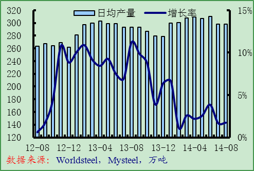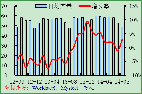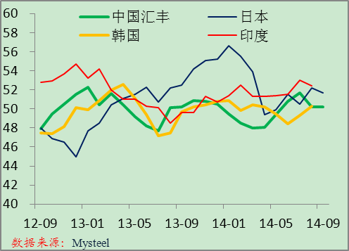8月份亞洲粗鋼日均產(chǎn)量達(dá)到298.4噸,環(huán)比增長0.1%,同比增長1.7%,韓國和印度產(chǎn)量增長明顯。根據(jù)中鋼協(xié)的統(tǒng)計,9月份中國重點(diǎn)鋼企粗鋼日均產(chǎn)量環(huán)比小幅下降,而Mysteel調(diào)查的9月份全國鋼鐵PMI產(chǎn)出指數(shù)也有所下降。預(yù)計9月份亞洲粗鋼日均產(chǎn)量將環(huán)比下降。