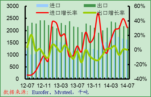 8月份歐洲粗鋼日均產(chǎn)量為48.9萬噸,環(huán)比下降7%,同比增長2.8%,需求季節(jié)性下降所致。9月份歐洲需求季節(jié)性復(fù)蘇,預(yù)計粗鋼日均產(chǎn)量將環(huán)比回升。7月份歐盟出口鋼材215萬噸,同比增長0.2%,進(jìn)口鋼材163萬噸,同比增長31%,凈出口量52萬噸,同比下降42%,環(huán)比持平。9月份歐元兌美元大幅貶值,歐洲鋼廠的進(jìn)口壓力明顯緩解,而出口競爭力得到加強(qiáng),預(yù)計四季度歐洲鋼材凈出口量將環(huán)比大幅回升。