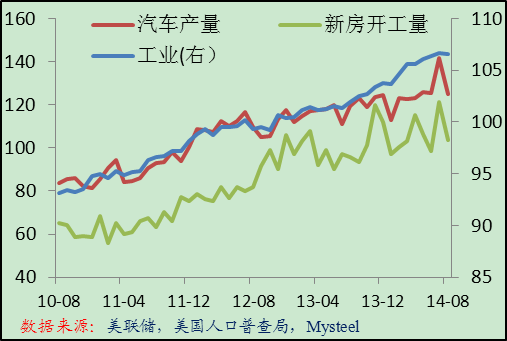 從下游行業(yè)看,8月份美國經(jīng)濟(jì)強(qiáng)勁增長態(tài)勢放緩,季節(jié)性因素可能是主因,但從同比增速看,美國經(jīng)濟(jì)強(qiáng)勁增長趨勢可能將放緩。8月份汽車產(chǎn)量同比增長4.5%,環(huán)比下降11.7%;工業(yè)產(chǎn)出同比增長4.8%,環(huán)比下降0.1%;新房開工量同比增長8%,環(huán)比下降14.4%。