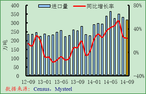 8月份美國鋼材進(jìn)口量為333萬噸,同比增長27.4%,但環(huán)比下降5%。分品種看,與去年8月份相比,主要品種進(jìn)口量均實(shí)現(xiàn)增長,依然是冷軋、鍍鋅板與中厚板的進(jìn)口量增長最明顯,其中中厚板增長114%,冷軋增長65.7%,鍍鋅板增長46.1%。與今年7月份比,除半成品、長材、線材和螺紋鋼進(jìn)口量環(huán)比增長外,其他品種均環(huán)比下降,其中螺紋鋼增長最快,為191.5%。最新的統(tǒng)計數(shù)據(jù)顯示,截至到2014年9月24日,9月份美國鋼材進(jìn)口許可證數(shù)為317萬噸,高于去年9月水平,與8月份同期數(shù)據(jù)基本持平,預(yù)計今年9月份美國鋼材進(jìn)口量同比仍將大幅增加,環(huán)比基本持平或略有增長。