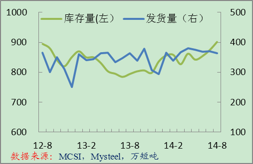 8月末美國金屬服務(wù)中心的鋼材庫存達(dá)到901.4萬短噸,環(huán)比增長3.1%,同比增長13.5%,創(chuàng)兩年來最高水平。8月份美國服務(wù)中心的發(fā)貨量為364萬短噸,同比略微增長,環(huán)比下降1.7%。按照供應(yīng)天數(shù)計算,8月末的鋼材庫存為2.5個月供應(yīng)量,7月末為2.4個月供應(yīng)量。2013年8月末為2.2個月供應(yīng)量。
