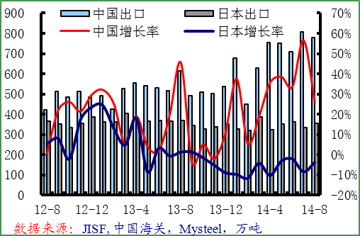 8月份中國鋼材出口778萬噸,同比增長26.4%,環(huán)比下降3.7%。9月份中國鋼材市場大幅下滑,鋼材出口進(jìn)一步增強(qiáng),PMI調(diào)查也顯示出口訂單增長,預(yù)計9月份中國鋼材出口依然保持在高水平。8月日本鋼鐵出口量為356萬噸,同比下降3.8%,環(huán)比增長6.7%,主要是日元貶值帶動。9月份日元大幅貶值,日本鋼材出口競爭力再次加強(qiáng),預(yù)計出口量將繼續(xù)環(huán)比增長。