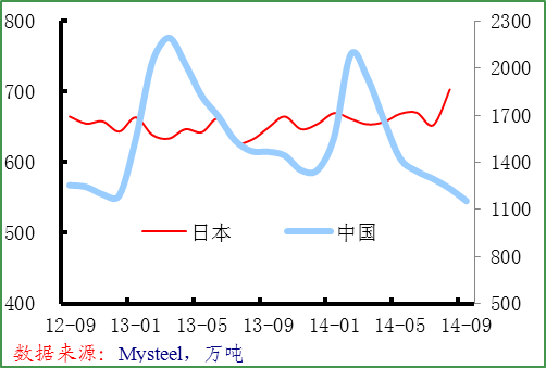9月份中國流通環(huán)節(jié)鋼材庫存繼續(xù)下降,9月底全國主要鋼的社會庫存為1154萬噸,比8月底下降80萬噸,較去年同期下降314萬噸,鋼廠價格大幅下滑,貿(mào)易商加大了去庫存力度。中鋼協(xié)統(tǒng)計數(shù)據(jù)顯示,9月中旬末重點(diǎn)鋼企鋼材庫存為1590萬噸,較8月中旬末增長65萬噸,全國重點(diǎn)鋼廠鋼廠庫存連續(xù)兩個月增長。日本國內(nèi)庫存大幅上升,8月末全國鋼材庫存為703萬噸,創(chuàng)10年來最高水平,鋼廠庫存增長明顯,市場需求難以消化供應(yīng)。