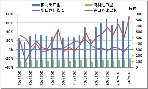 2014年9月我國出口鋼材852萬噸,創(chuàng)下歷史新高,同比大增73.2%。一方面,上年同期基數(shù)較低,導(dǎo)致9月鋼材出口同比增速上升明顯。另一方面,9月我國鋼材出口均價加速下跌,國際競爭優(yōu)勢明顯,進(jìn)一步刺激鋼材出口。當(dāng)月鋼材出口均價739美元/噸,環(huán)比下降4.9%,同比下降10.7%。