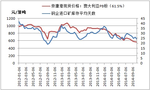 圖三:鋼企進(jìn)口礦庫存天數(shù)與京唐港澳粉價格走勢