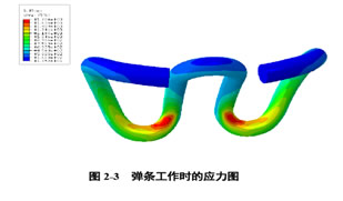 彈條是高速鐵路扣件系統(tǒng)中的核心部件。我國高速鐵路采用的是ω形彈條。彈條的作用是將鋼軌牢牢地固定在鐵墊板上,除必須有一定扣壓力外,還必須能承受來自鋼軌的垂向力、橫向力和縱向力的作用。在工作過程中,彈條不僅有彎曲變形,還有扭曲變形,本身呈現比較復雜的應力狀態(tài)。下圖是在初始扣壓力下用有限元軟件分析的彈條應力圖。從圖中可以看出:兩臂與中間兩肢連接處是變形集中的部位,急劇的彎曲變形引起彈條疲勞壽命降低。應力最大處在彈條外側兩臂與中間兩肢連接之處,這也是彈條實際失效之處。
