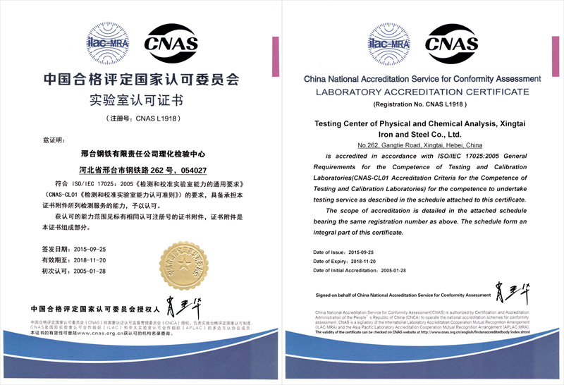 The three affiliated laboratories of this physical and chemical inspection center means products test room of quality control department, central test cabinet and researching lab of technical center. Xingtai Steel has set up laboratory management system according to ISO/IEC17025 principles since June of 2004. It was the first time to pass laboratory approval of CNAS on Jan.28, 2005, meanwhile obtain approval certificate. CNAS confirmed detectabilities of the physical and chemical inspection center on steel and iron material, iron ore, metal and ferromagnetic materials. The approved projects could use identification approved by CNAS and ILAC-MRA/CNAS identification approved by ILAC.CNAS processed the third time review for physical and chemical inspection center of Xingtai Steel with unanimous passage.