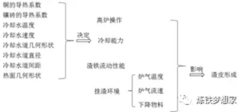 對于爐腹、爐腰及爐身下部等高熱負荷區(qū)域,無論是鑄鐵冷卻壁還是銅冷卻壁,渣皮的保護作用對冷卻系統(tǒng)的長壽至關重要。冷卻壁熱面存在穩(wěn)定渣皮時,塊狀帶物料、熔融渣鐵及高溫煤氣等不能直接接觸冷卻壁壁體,從而減少磨損、渣鐵侵蝕、“氫病”及有害元素等問題的發(fā)生,大幅提高冷卻壁壽命。渣皮的形成過程受多方面因素影響,如圖1所示。