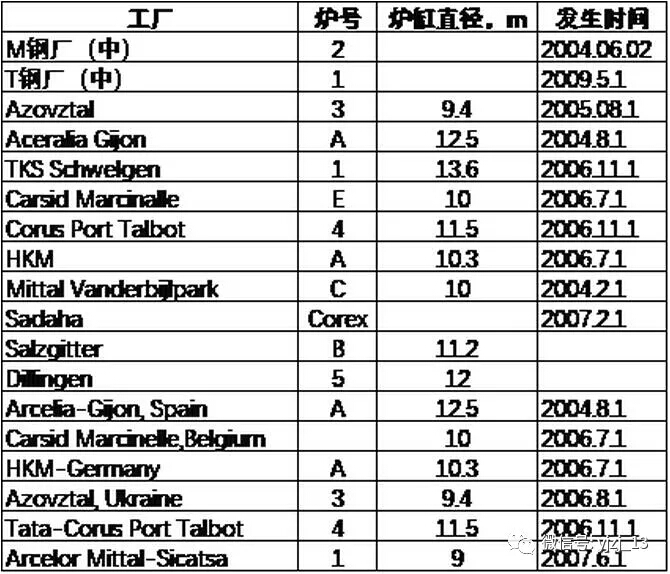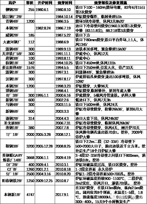 以下針對(duì)國內(nèi)外典型高爐爐缸燒出案例進(jìn)行統(tǒng)計(jì),并對(duì)燒出原因、修復(fù)和維護(hù)等方面進(jìn)行詳細(xì)的說明,為國內(nèi)外高爐的長壽提供技術(shù)和數(shù)據(jù)參考。