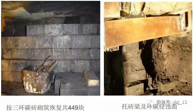 利用工程剩余的UCAR炭磚重新砌筑,部分炭磚需要現(xiàn)場加工外型,縫隙采用炭質(zhì)泥漿??傆?jì)砌筑11層,449塊炭磚。