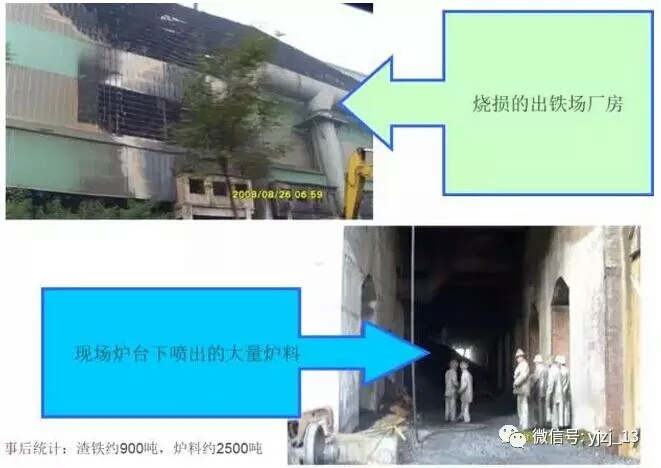 事后確認(rèn):4#鐵口下方爐缸燒穿,大量渣鐵和炙熱的爐料(焦炭、礦石)噴出,現(xiàn)場燒損嚴(yán)重(新3高爐本體電纜、煤粉噴吹總線電纜、新2高爐電源電纜、計(jì)量儀表電纜、出鐵場天棚、4#爐前炮、開口機(jī)、東場及北場爐前吊車、爐前休息室、電梯等燒損。)
