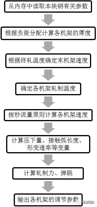 圖1所示為精軋?jiān)O(shè)定模型計(jì)算原理圖的主要思路,不代表編寫(xiě)程序所用的細(xì)框圖,因此只是展現(xiàn)了大概的計(jì)算流程,看圖可以初步了解精軋?jiān)O(shè)定模型的大致控制思路。