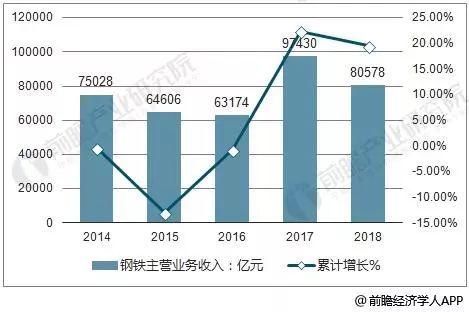 據(jù)前瞻產(chǎn)業(yè)研究院發(fā)布的《中國鋼鐵行業(yè)發(fā)展前景與投資戰(zhàn)略規(guī)劃分析報告》指出,2018上半年中國鋼鐵行業(yè)主營業(yè)務(wù)收入達到30525億元,累計增長15.8%?;仡?012-2017年鋼鐵行業(yè)營業(yè)收入情況:近六年來,我國鋼行業(yè)營業(yè)收入較為穩(wěn)定,2015年以來累計增長率逐漸回暖。中國鋼鐵行業(yè)將繼續(xù)保持穩(wěn)中有長趨勢,預(yù)計2018年中國鋼鐵行業(yè)營收將突破80000億元。