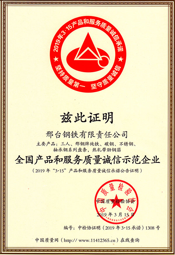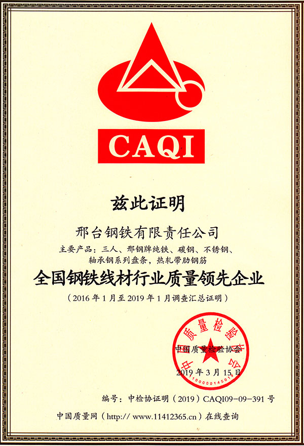In early 2019, Xingtai Steel participated in a theme activity focusing on the product  quality and service commitment organized by China Association for Quality Inspection. Recently, Xingtai Steel was awarded the title of "Leading Enterprise of High-Quality Steel in National Steel Wire Industry" and "National Product and Service Quality Integrity Model Enterprises" by China Association for Quality Inspection. The main products including pure iron, carbon steel, stainless steel, wire rod for bearing and hot rolled ribbed steel bar of Three Person Brand were awarded the title of “Products with Excellent Quality Stability in China”.