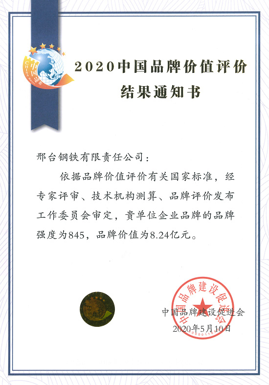 In Chinese Brands Day, “2020 China brand value evaluation information release” online activities were held. Recently, Xingtai Steel received the notification of evaluation results. It is shown that our company getson the brand value ranking list of nonferrous metallurgy group. This is the first time that Xingtai Steel hasgoton this list.