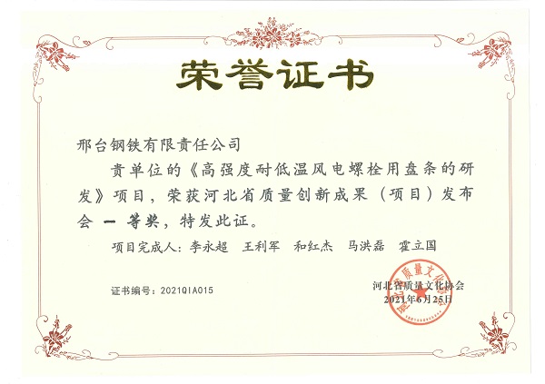 近日,由河北省質(zhì)量文化協(xié)會(huì)主辦的“河北省第四屆質(zhì)量創(chuàng)新成果(項(xiàng)目)發(fā)布會(huì)”在秦皇島召開(kāi),邢鋼精益六西格瑪代表團(tuán)3個(gè)成果入圍發(fā)布會(huì)名單,其中《高強(qiáng)度耐低溫風(fēng)電螺栓用盤(pán)條的研發(fā)》和《提高不銹鋼1Cr13澆次連澆爐數(shù)》榮獲一等獎(jiǎng),《提高Q55SiCrA-1線材成材率》榮獲二等獎(jiǎng)。