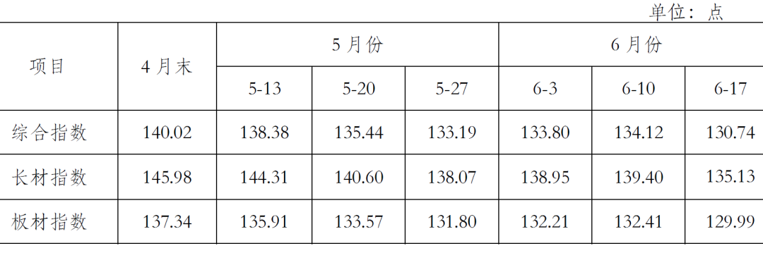 5月末,CSPI長(zhǎng)材指數(shù)為138.07點(diǎn),環(huán)比下降7.91點(diǎn),降幅為5.42%;CSPI板材指數(shù)為131.80點(diǎn),環(huán)比下降5.54點(diǎn),降幅為4.03%。與上年同期相比,長(zhǎng)材、板材指數(shù)分別下降9.58點(diǎn)和11.48點(diǎn),降幅分別為6.49%和8.01%。(見(jiàn)下表)