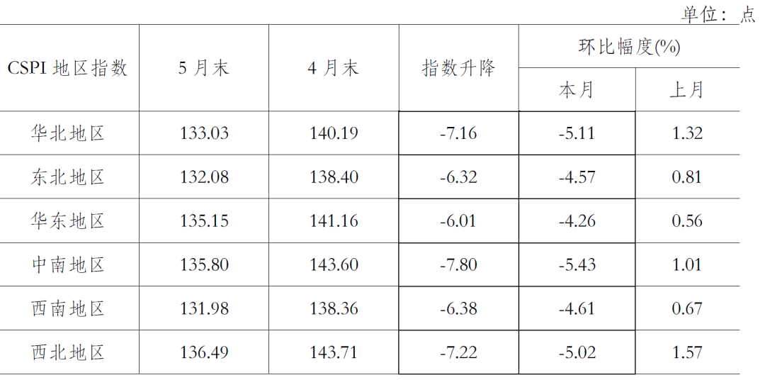 5月份,CSPI全國(guó)六大地區(qū)鋼材價(jià)格指數(shù)均由升轉(zhuǎn)降。其中中南地區(qū)降幅較大,環(huán)比下降5.43%;華東地區(qū)降幅較小,環(huán)比下降4.26%;華北、東北、西南和西北地區(qū)鋼價(jià)指數(shù)環(huán)比分別下降5.11%、4.57%、4.61%和5.02%。(見(jiàn)下表)