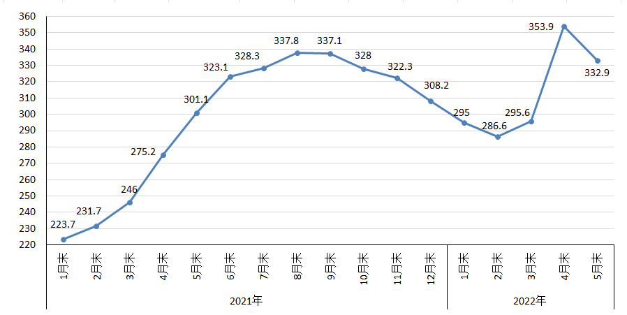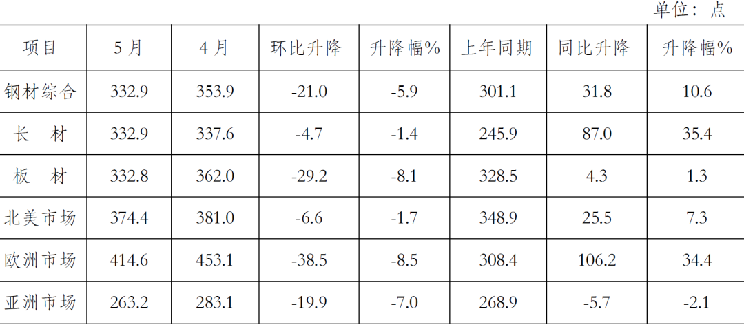 5月份,CRU國(guó)際鋼材價(jià)格指數(shù)為332.9點(diǎn),環(huán)比下降21.0點(diǎn),降幅為5.9%;同比上升31.8點(diǎn),升幅為10.6%。(見(jiàn)下圖)