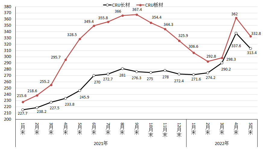 CRU長(zhǎng)材和板材價(jià)格指數(shù)走勢(shì)圖