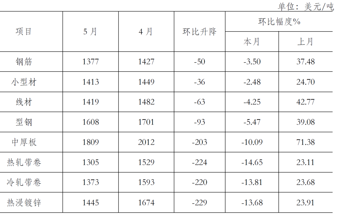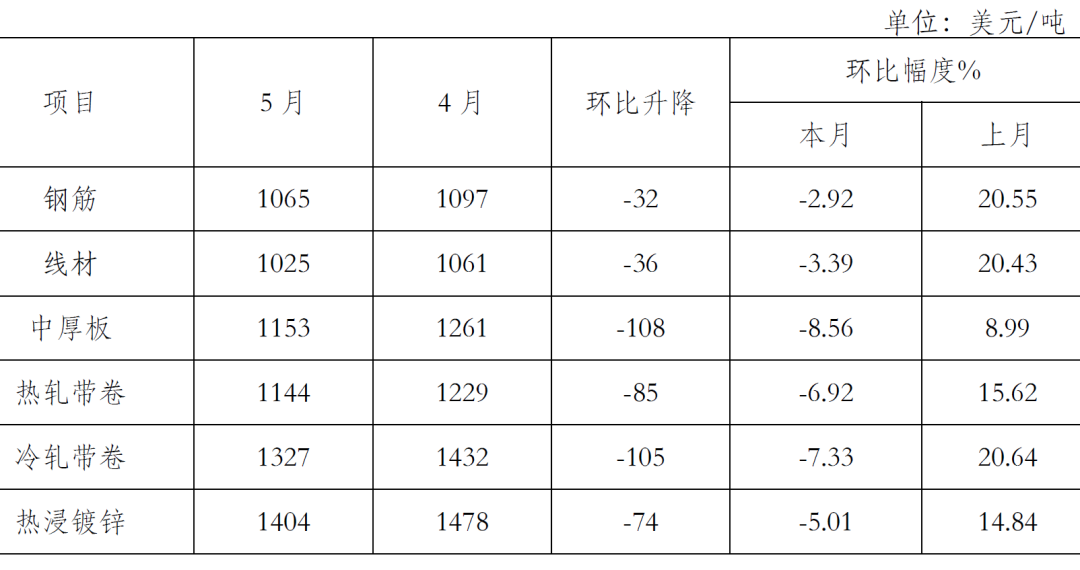5月份,鋼鐵產(chǎn)量持續(xù)環(huán)比增長(zhǎng)。吉林,上海等疫情嚴(yán)重地區(qū)開(kāi)始復(fù)工復(fù)產(chǎn)、國(guó)家穩(wěn)增長(zhǎng)政策相繼出臺(tái),對(duì)需求的拉動(dòng)還不明顯,國(guó)內(nèi)市場(chǎng)鋼材需求增長(zhǎng)不及預(yù)期,加上鋼鐵生產(chǎn)環(huán)比增長(zhǎng),以及原燃材料價(jià)格在前期大漲后有所回落,致使鋼材價(jià)格呈小幅下行走勢(shì)。