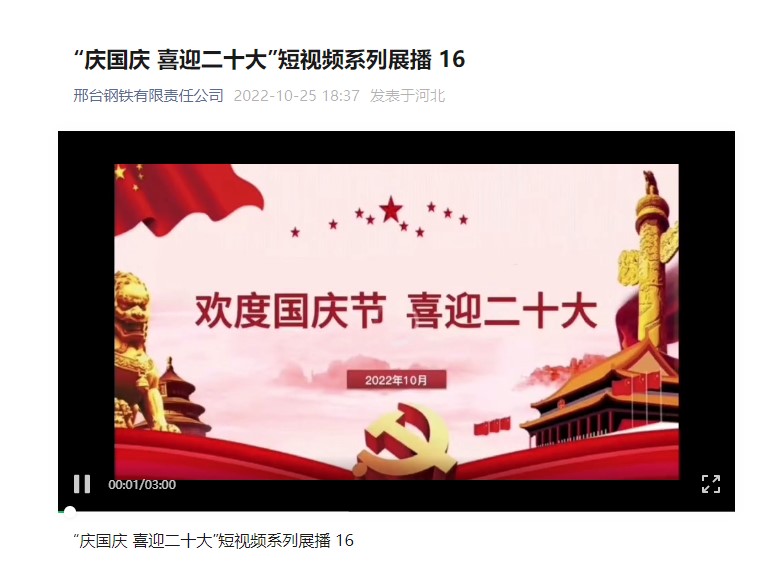 二十大期間,邢鋼組織開展了“慶國慶,喜迎二十大”邢鋼快閃短視頻、邢鋼故事短視頻作品征集活動(dòng),展示了公司良好的企業(yè)形象和員工的精神風(fēng)貌。目前,短視頻作品正在通過邢鋼“企業(yè)微信”、微信公眾號(hào)平臺(tái)和公司內(nèi)網(wǎng)“視頻新聞”欄目陸續(xù)展播中。