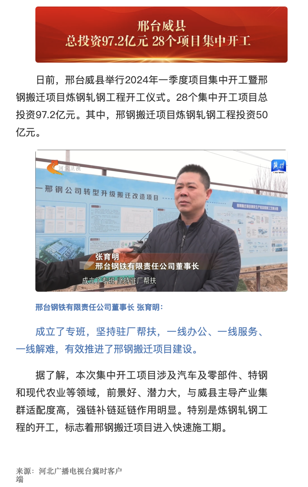 2月27日河北電視臺《河北新聞聯(lián)播》關(guān)注報道邢鋼,公司黨委書記、董事長張育明接受記者采訪。
