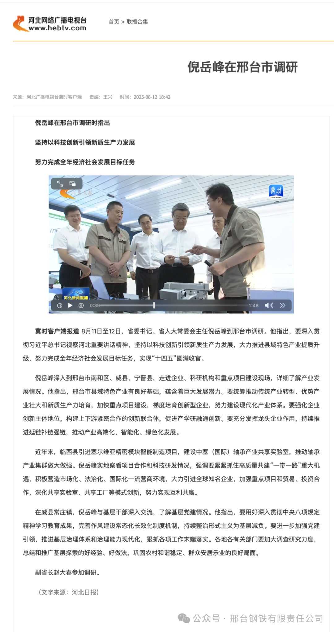 冀時(shí)客戶端報(bào)道 8月11日至12日,省委書記、省人大常委會(huì)主任倪岳峰到邢臺(tái)市調(diào)研。他指出,要深入貫徹習(xí)近平總書記視察河北重要講話精神,堅(jiān)持以科技創(chuàng)新引領(lǐng)新質(zhì)生產(chǎn)力發(fā)展,大力推進(jìn)縣域特色產(chǎn)業(yè)提質(zhì)升級,努力完成全年經(jīng)濟(jì)社會(huì)發(fā)展目標(biāo)任務(wù),實(shí)現(xiàn)“十四五”圓滿收官。