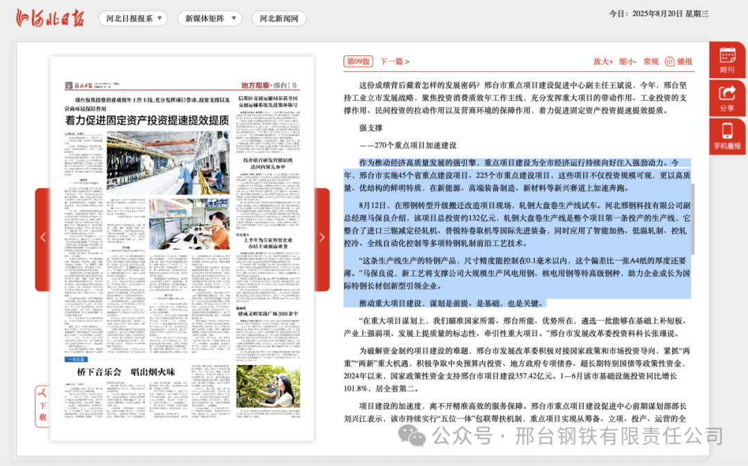 8月12日,在邢鋼轉(zhuǎn)型升級(jí)搬遷改造項(xiàng)目現(xiàn)場(chǎng),軋鋼大盤卷生產(chǎn)線試車。河北邢鋼科技有限公司副總經(jīng)理馬保良介紹,該項(xiàng)目總投資約132億元,軋鋼大盤卷生產(chǎn)線是整個(gè)項(xiàng)目第一條投產(chǎn)的生產(chǎn)線,它整合了進(jìn)口三輥減定徑軋機(jī)、普銳特卷取機(jī)等國(guó)際先進(jìn)裝備,同時(shí)應(yīng)用了智能加熱、低溫軋制、控軋控冷、全線自動(dòng)化控制等多項(xiàng)特鋼軋制前沿工藝技術(shù)。“這條生產(chǎn)線生產(chǎn)的特鋼產(chǎn)品,尺寸精度能控制在0.1毫米以內(nèi),這個(gè)偏差比一張A4紙的厚度還要薄。”馬保良說,新工藝將支撐公司大規(guī)模生產(chǎn)風(fēng)電用鋼、核電用鋼等特高級(jí)鋼種,助力企業(yè)成長(zhǎng)為國(guó)際特鋼長(zhǎng)材創(chuàng)新型引領(lǐng)企業(yè)。