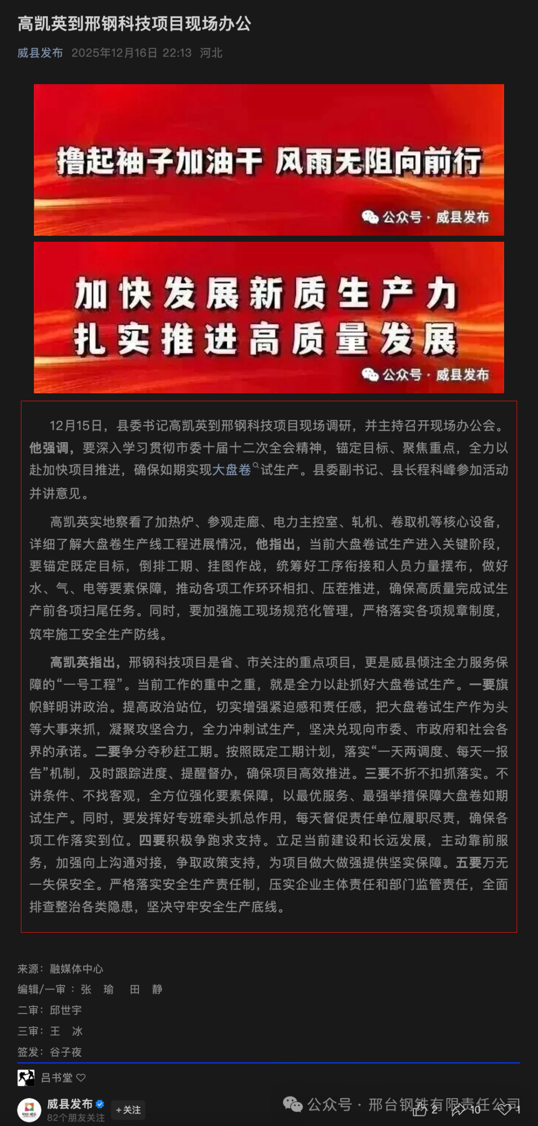 高凱英指出,邢鋼科技項(xiàng)目是省、市關(guān)注的重點(diǎn)項(xiàng)目,更是威縣傾注全力服務(wù)保障的“一號(hào)工程”。當(dāng)前工作的重中之重,就是全力以赴抓好大盤(pán)卷試生產(chǎn)。一要旗幟鮮明講政治。提高政治站位,切實(shí)增強(qiáng)緊迫感和責(zé)任感,把大盤(pán)卷試生產(chǎn)作為頭等大事來(lái)抓,凝聚攻堅(jiān)合力,全力沖刺試生產(chǎn),堅(jiān)決兌現(xiàn)向市委、市政府和社會(huì)各界的承諾。二要爭(zhēng)分奪秒趕工期。按照既定工期計(jì)劃,落實(shí)“一天兩調(diào)度、每天一報(bào)告”機(jī)制,及時(shí)跟蹤進(jìn)度、提醒督辦,確保項(xiàng)目高效推進(jìn)。三要不折不扣抓落實(shí)。不講條件、不找客觀,全方位強(qiáng)化要素保障,以最優(yōu)服務(wù)、最強(qiáng)舉措保障大盤(pán)卷如期試生產(chǎn)。同時(shí),要發(fā)揮好專班牽頭抓總作用,每天督促責(zé)任單位履職盡責(zé),確保各項(xiàng)工作落實(shí)到位。四要積極爭(zhēng)跑求支持。立足當(dāng)前建設(shè)和長(zhǎng)遠(yuǎn)發(fā)展,主動(dòng)靠前服務(wù),加強(qiáng)向上溝通對(duì)接,爭(zhēng)取政策支持,為項(xiàng)目做大做強(qiáng)提供堅(jiān)實(shí)保障。五要萬(wàn)無(wú)一失保安全。嚴(yán)格落實(shí)安全生產(chǎn)責(zé)任制,壓實(shí)企業(yè)主體責(zé)任和部門(mén)監(jiān)管責(zé)任,全面排查整治各類隱患,堅(jiān)決守牢安全生產(chǎn)底線。